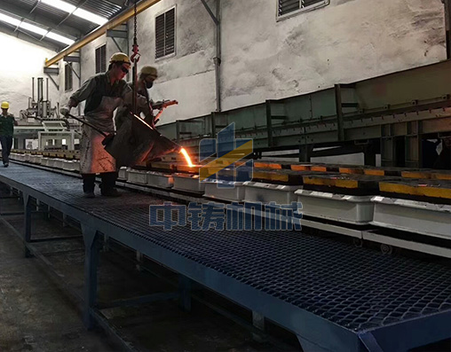 1、全自動(dòng)造型機(jī)打出來砂型直接在鏈板線上循環(huán)輸送,可以是單排雙列,也可以雙排雙列;
